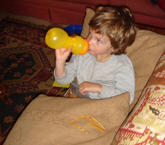 Last night Daddy flew home on a plane from a quick trip to L.A. He arrived just as we were having our bedtime story. We were very excited! Jeremy ran over and gave Daddy a big hug and said: "I missed you Daddy!" Alex pleaded: "Take off work shoes!" (Daddy says on the airline he flies passengers only get one bag of pretzels. We think we'll stick with our Couch Airways flights.)